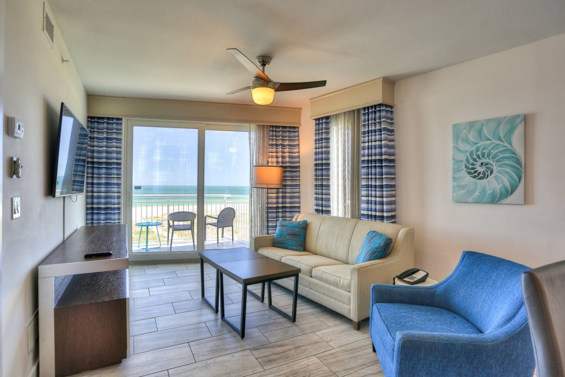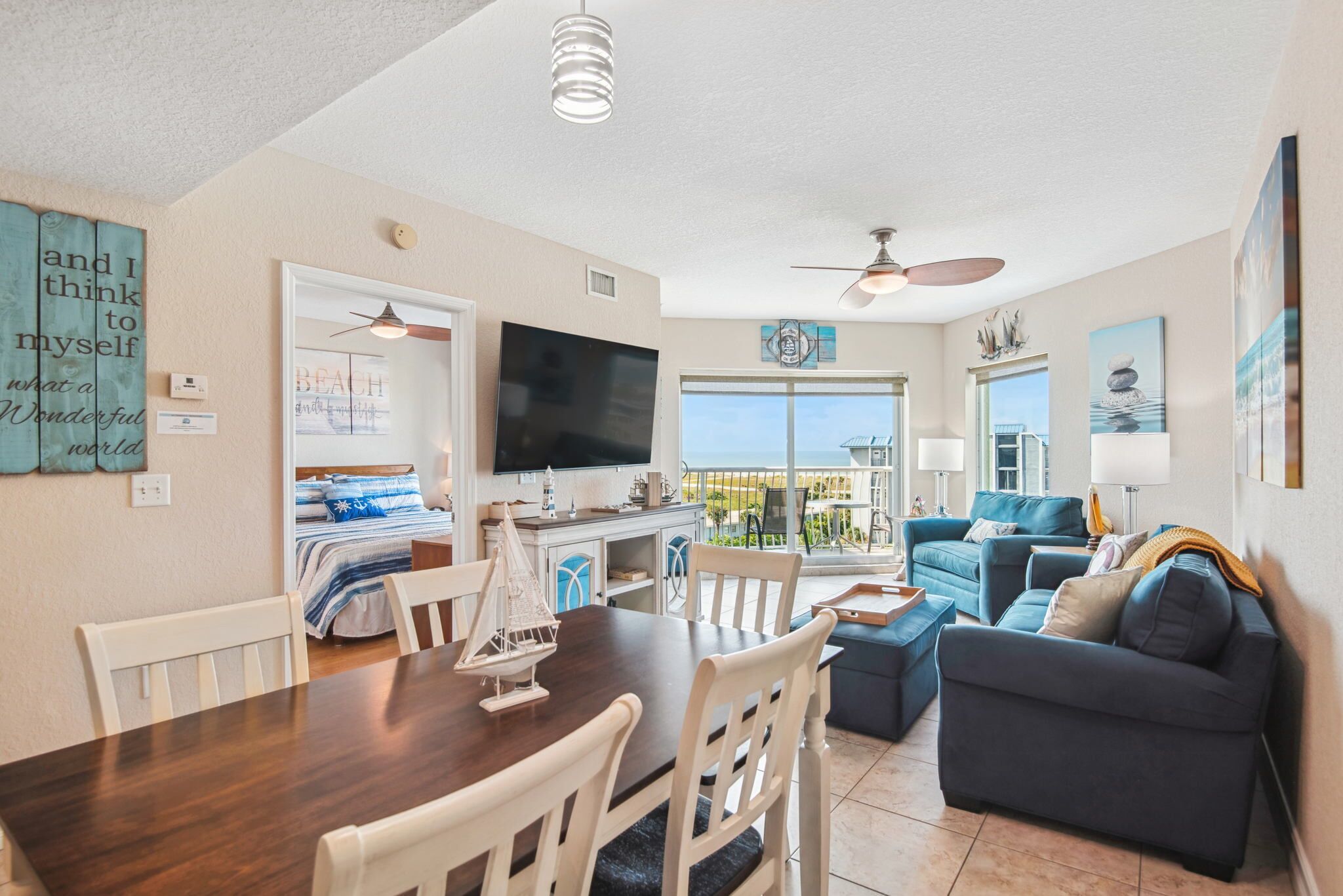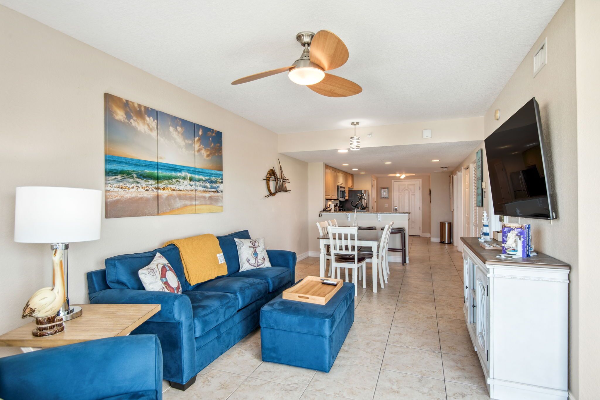 - Living Room has a queen sofa bed, twin sofa bed, and smart TV